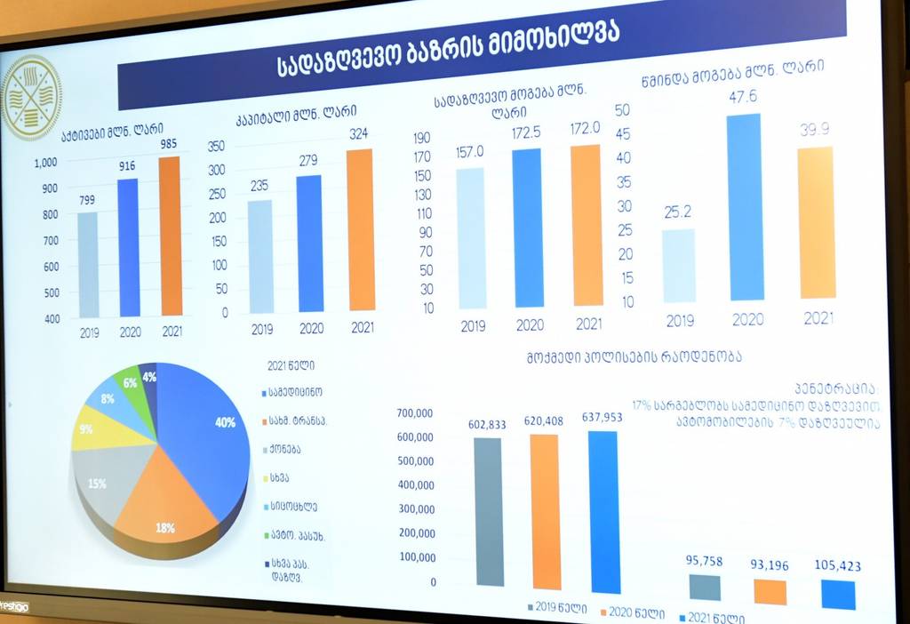 საფინანსო-საბიუჯეტო კომიტეტის თავმჯდომარის ირაკლი კოვზანაძის განცხადებით, რომელიც ამავდროულად დაზღვევის სახელმწიფო ზედამხედველობის სამსახურის სამეთვალყურეო საბჭოს თავმჯდომარეა, 31 მაისის მდგომარეობით 18 სადაზღვევო კომპანიის აქტივები 1 მილიარდ 126 მილიონი ლარია, რაც 8%-ით მეტია წინა წლის ანალოგიურ პერიოდთან შედარებით, ხოლო კაპიტალი გაზრდილია 12%-ით, რაც 319,1 მლნ. ლარს შეადგენს. „2022 წლის 5 თვის განმავლობაში ფინანსურმა მოზიდულმა პრემიამ შეადგინა 399,5 მლნ. ლარი, რაც 10%-ით მეტია წინა წლის ამავე პერიოდის მონაცემზე. 19%-ით გაზრდილია ანაზღაურებული ზარალები და შეადგენს 186 მლნ ლარს. კომპანიების სადაზღვევო მოგება 77 მლნ 300 ათასი ლარია, ზრდა 14%-ია. ხოლო წმინდა მოგება 9 მლნ 400 ათასი ლარია“, - განაცხადა ირაკლი კოვზანაძემ და მოგების შემცირების მიზეზებიც განმარტა.